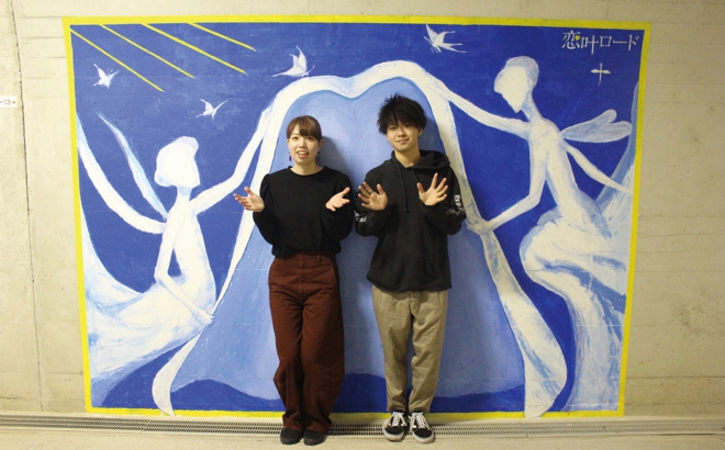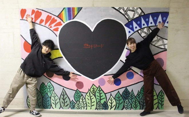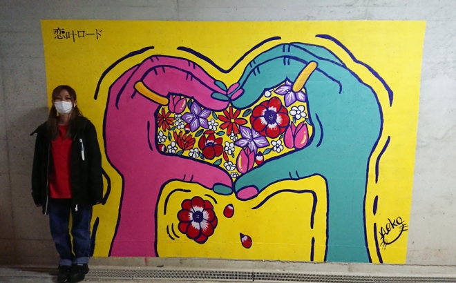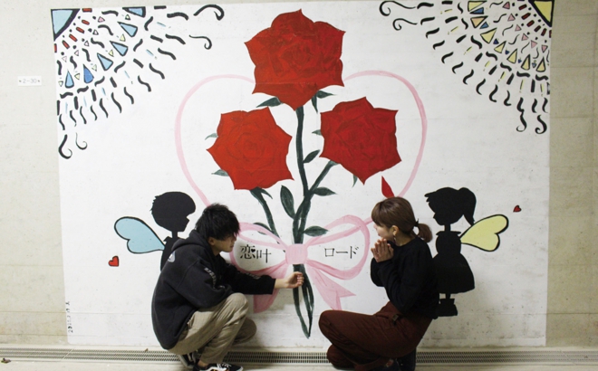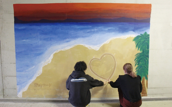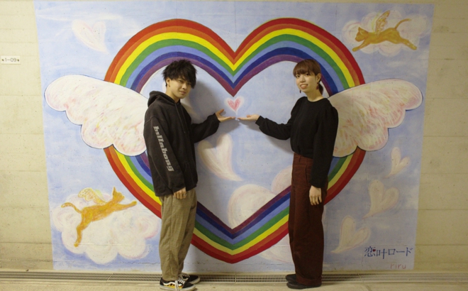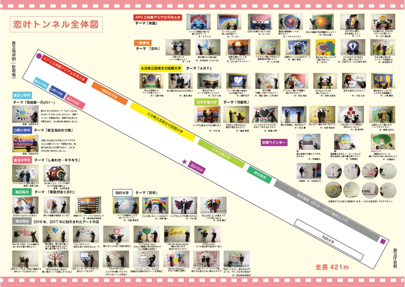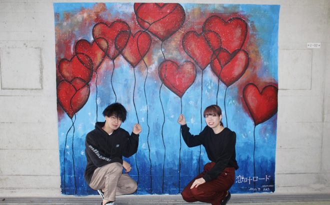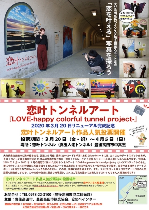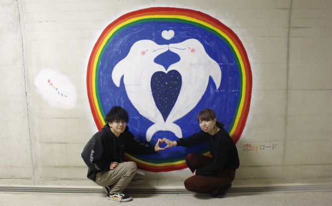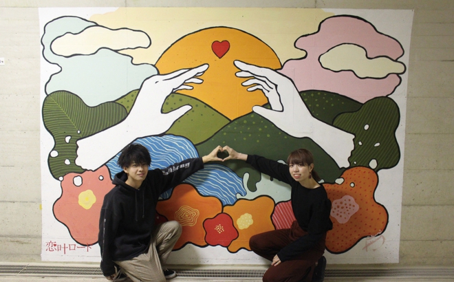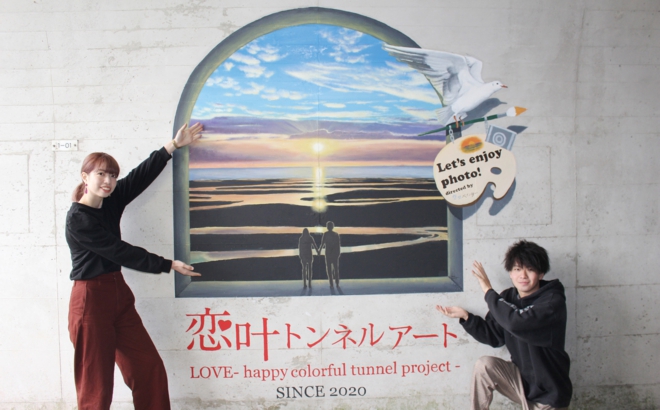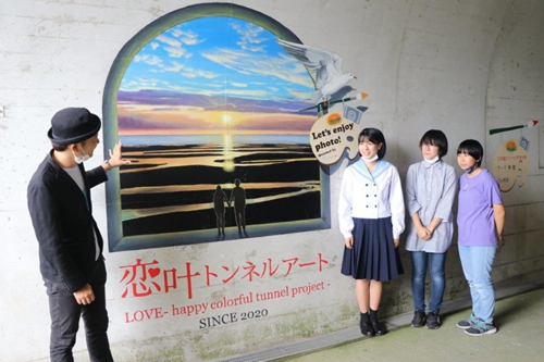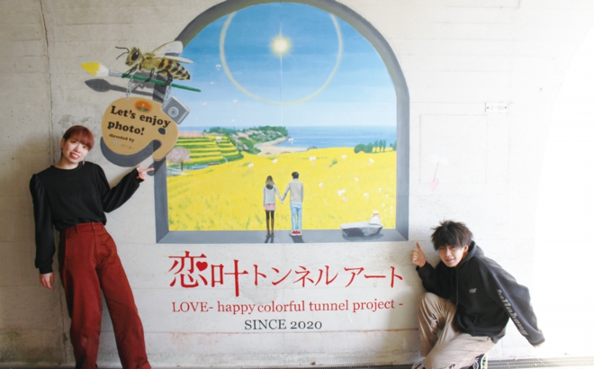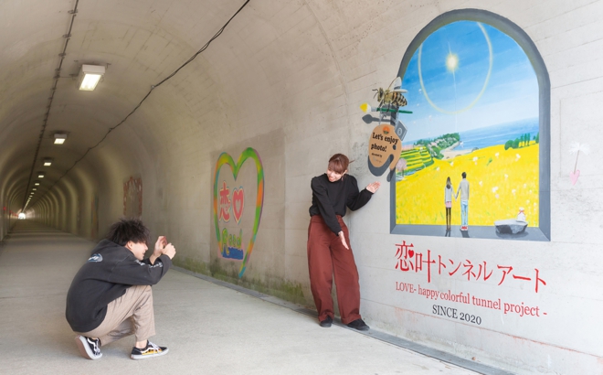 その後、総合ディレクターとして壁画アーティストの空間ペインター芳賀健太氏を迎え、恋叶トンネルアート「LOVE-happy colorful tunnel project-」というプロジェクトのもと、2019年8月~2020年3月の期間で、更にトンネル内の残りの壁面に、有志で集まった県内8校の学生たちと一般の方々の手で描き、恋を叶える場所(デートスポット)を自分たちで創るという大きな試みを行い、トンネル内には計50作品以上のフォトジェニックなアート作品が完成しました。