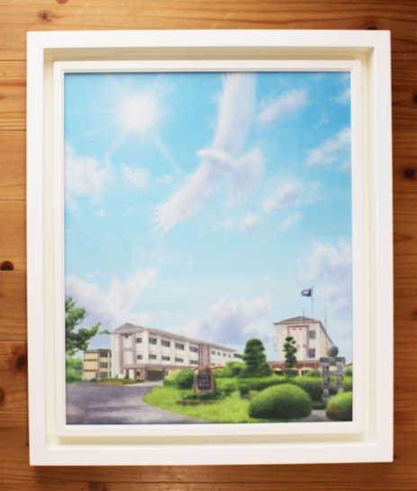 お客様の母校と、母校のキーワード「青鷹」というものを絵に入れてほしいとのリクエストで描いたものになります。