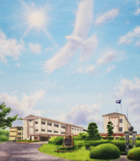 お客様の母校と、母校のキーワード「青鷹」というものを絵に入れてほしいとのリクエストで描いたものになります。