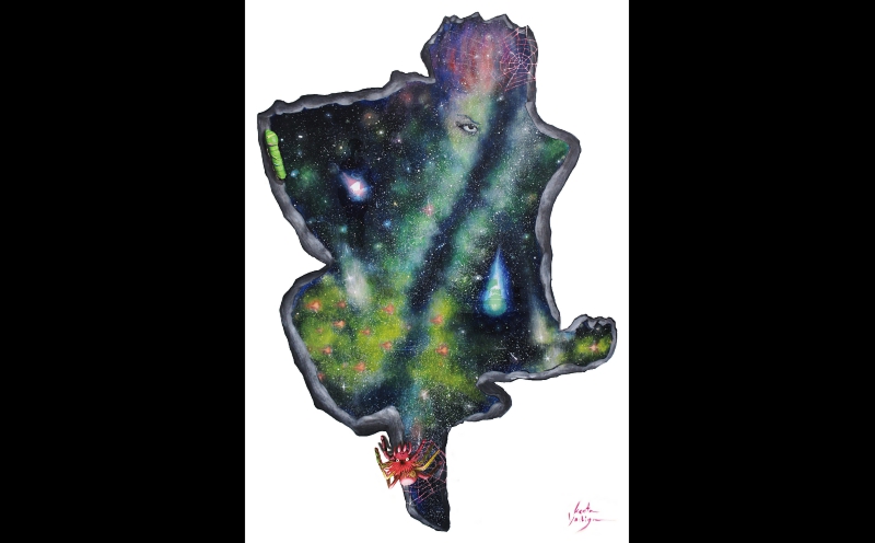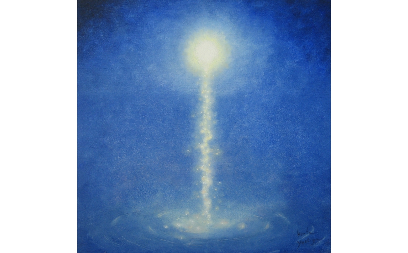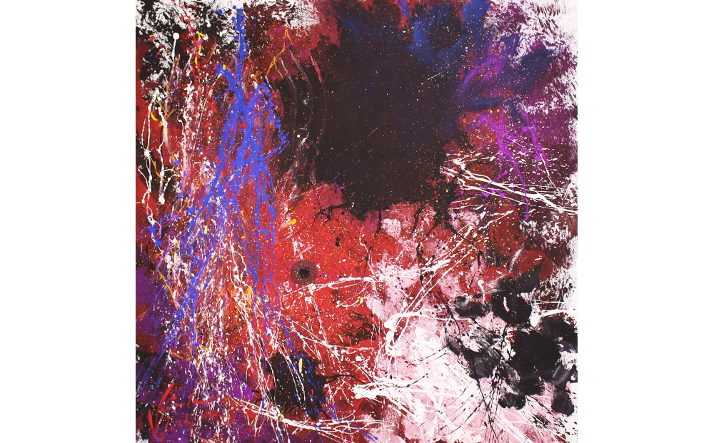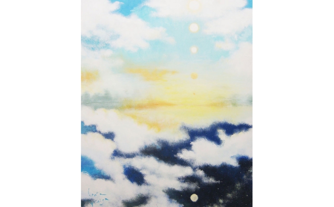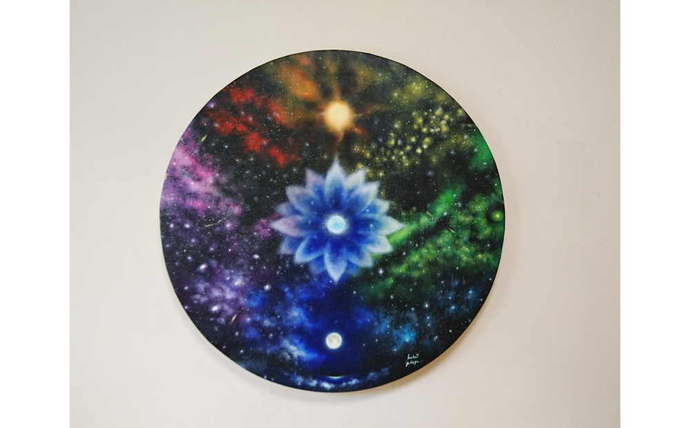 個展用制作:「en~咲き誇る宙~」F80号・キャンバス・アクリル画 2015.4 人とのご縁をテーマに描いた作品。四季の宇宙を背景として、火と水という全く別の物が交わり無限のエネルギーが生まれる姿を描いている。