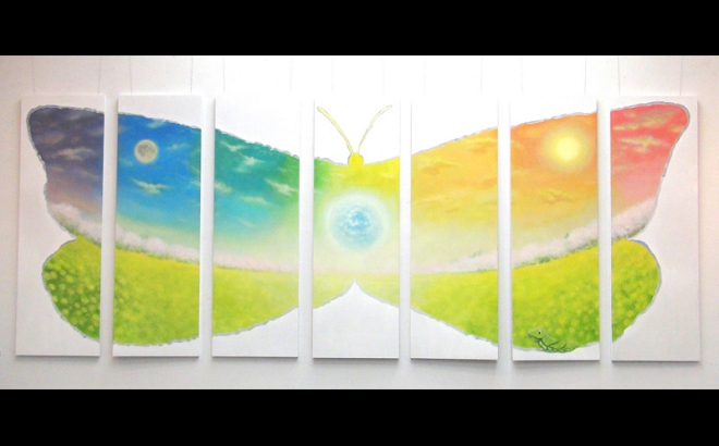 個展用制作:ゆめつくり虫~蝶和~ サイズ5m×1.8m 木製パネル アクリル 2013.3