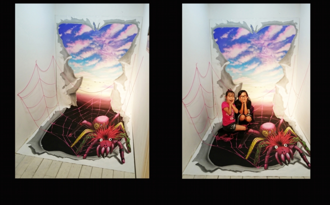 「虫雲~LET’S PLAY WITH PINK SPIDER~」サイズ壁と床共に縦2.7m×横1.7mキャンバス・アクリル画 2016.9 電脳音楽塾主催GRAPHIC BEATS 2016出展作品 hideさんのピンクスパイダーをモチーフに描いた3Dアート作品。