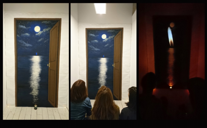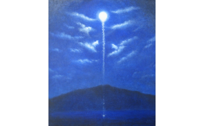 「優しき扉~ほしかぞえ~」サイズ縦2.5m×横1.7m・キャンバス・アクリル画 2017.9 電脳音楽塾主催GRAPHIC BEATS 2017 出展作品 hideさんのFLAMEをモチーフに描いた作品。演出として、hideさんの曲と波の音をかけながら、部屋を真っ暗にして、ろうそくの炎を小さなプロジェクターで映し出し、絵を鑑賞するという展示になった。